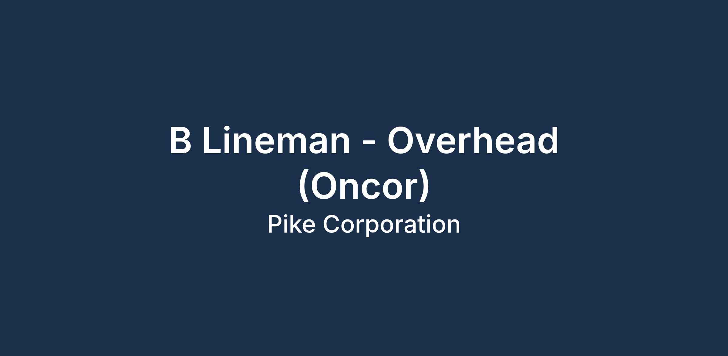 DescriptionPosition Summary: The Class B Lineman - Overhead is a semi-skilled position in the construction, maintenance and repair of electrical overhead distribution systems. This position works at various locations and may also be required to travel to another state depending on customer demands.