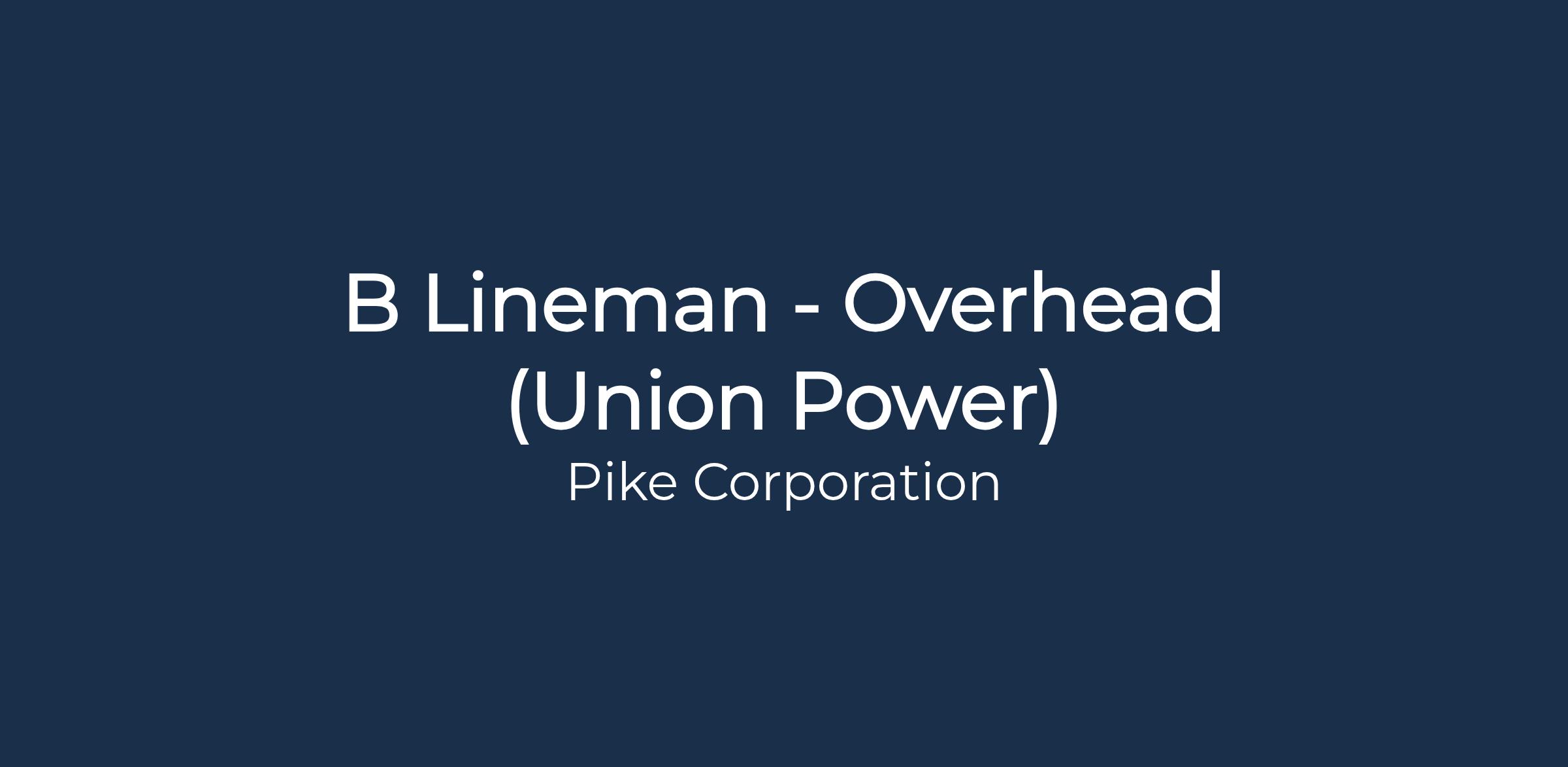 Position Summary: The Class B Lineman - Overhead is a semi-skilled position in the construction, maintenance and repair of electrical overhead distribution systems. This position works at various locations and may also be required to travel to another state depending on customer demands.
