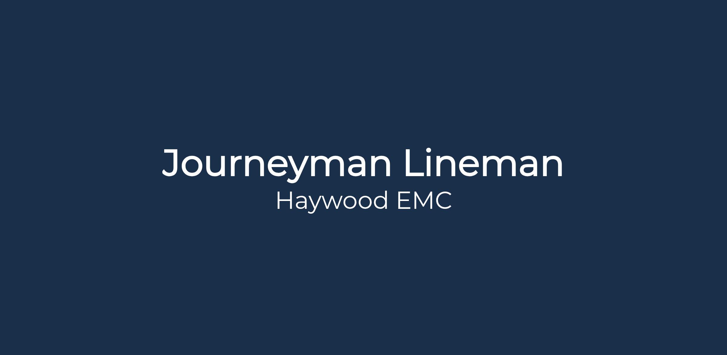 Haywood EMC is recruiting for a Journeyman Lineman to join our Waynesville crew. Candidate must have a high school diploma or equivalent and has successfully completed the NC apprenticeship progarm or equivalent program leading to full qualification as a Journeyman Lineman..